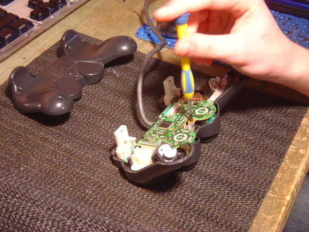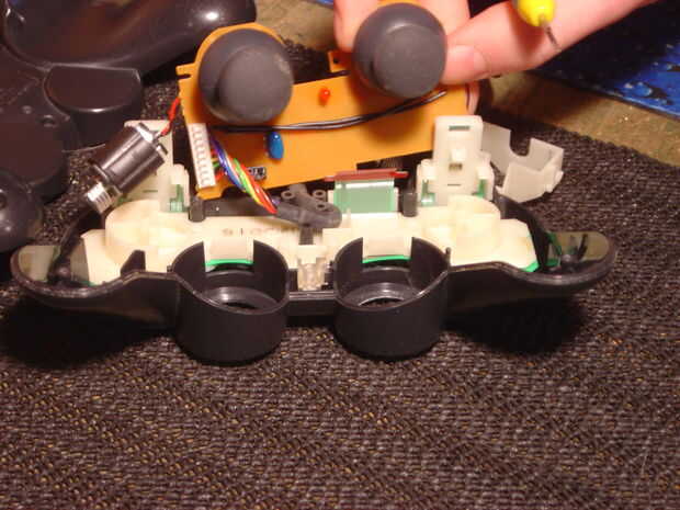 Lo siguiente que tienes que hacer es quitar los motores del PCB y rumble. Esto se logra extrayendo los motores (uno tiene un soporte de plástico, no lo suelta), quitar un tornillo, desenchufar el cable de cinta que viene de la estera conductora para los botones y sacar el PCB. Tenga en cuenta que hay un pequeño tubo de plástico ligero cerca del tornillo. Esto dirige la luz desde el LED de la PCB con el agujero para la luz de indicador analógico. No dejes pasar esto porque también ayuda a mantener el caso juntos. Después de tirar la placa hacia fuera, tendrá que tirar del cable que va a la PSX hacia fuera de alrededor de los postes de alivio de estrés. También, tirar de los palos de lo PCB por lo que se puede lavar.