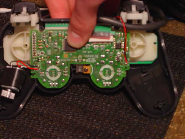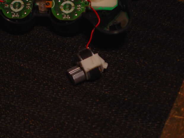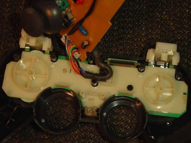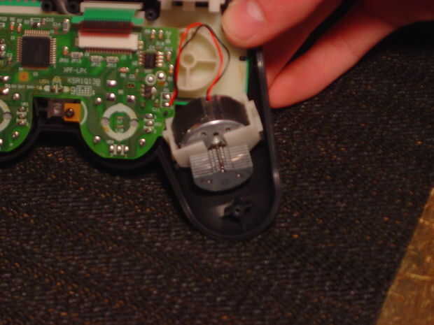 Ahora, vuelva a colocar el motor derecho (con el regulador abierto de la cara hacia abajo) en su soporte de plástico si se cayó hacia fuera y coloque en el caso. Hay algunos carriles de guía en el caso, así como un pequeño post que el agujero en el soporte va encima de. El motor izquierdo rumble sólo se asienta en el soporte moldeado en el caso.