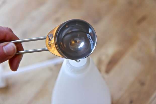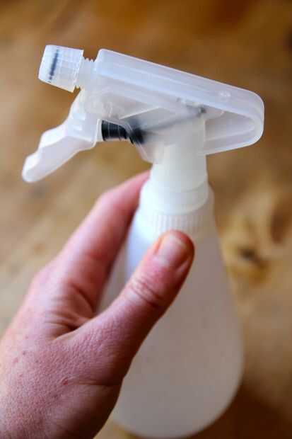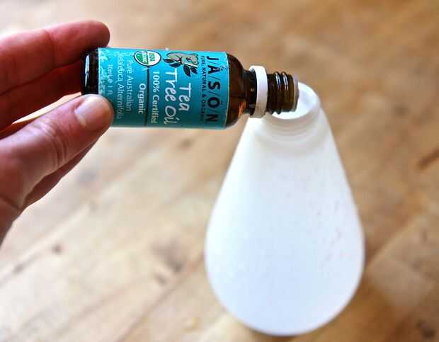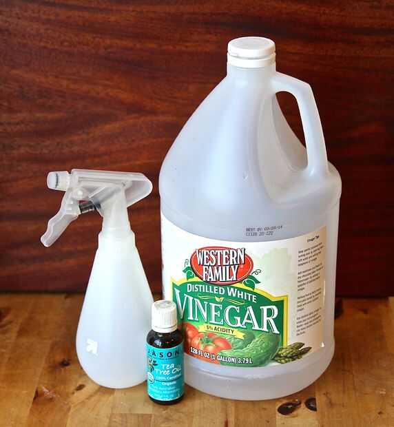 Añadir 1-2 cucharadas de vinagre blanco a su botella de spray. Llene hasta arriba con agua fría. Me gustaría añadir un par de gotas de aceite de árbol de té (4-5) así, pero es opcional. Vuelva a colocar la tapa de su botella de spray y agitar para mezclar.