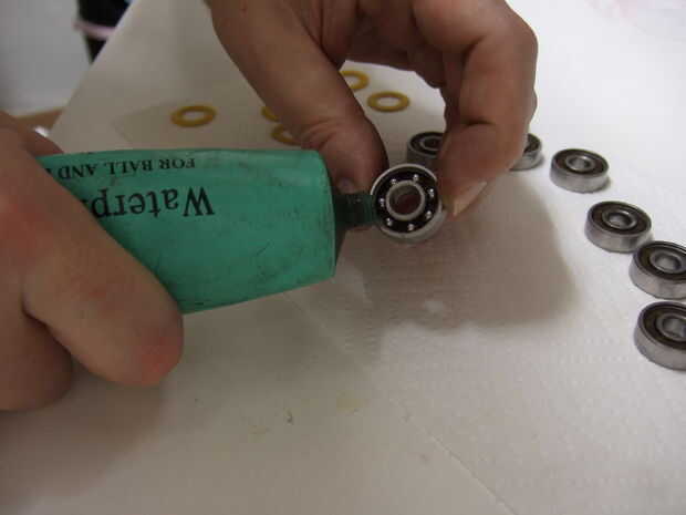 Nota en este escenario que podría utilizar un aceite en lugar de una grasa. Los aceites buenos son huesos velocidad crema, Tri-flow y otros aceites lubricantes similares. Aceite de motor funciona demasiado. Aceites malos son WD-40 y 3-en-1 (demasiado claro). Si utiliza aceite, 2 gotas son generalmente bastante. Difundirlo alrededor girando el rodamiento y volver a montar.