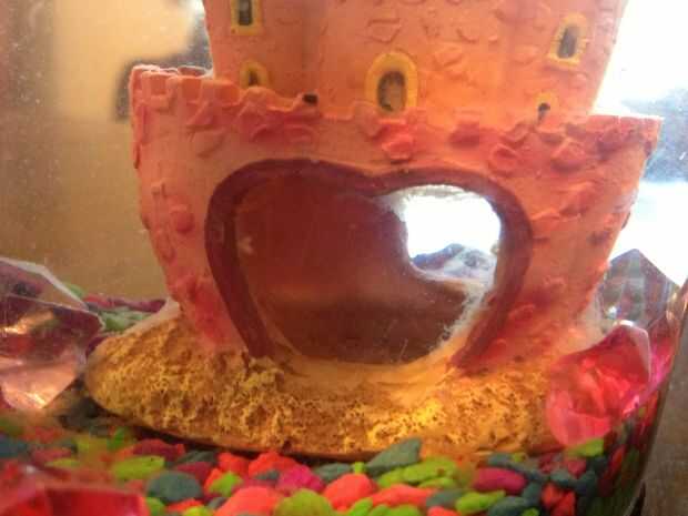 En la primera foto se puede ver cuán sucio su tanque era!!!!!! Usando su nuevo o solamente había utilizado anteriormente para pecera de limpieza, cepillo de dientes, friega lejos cualquier escoria o mineral depósitos en el tanque. Tuvimos algunas algas comenzando a crecer en nuestro por lo que tenía que ir. Como friega te encontrarás con limo viejo de su pez que él es desprendido en las superficies; sacar demasiado. Como se puede ver él depositó una gran cantidad de ese tipo de cosas en su castillo. Sacó el castillo y lavado apagado. Como se puede ver en la tercera foto, teníamos un poco de limo... Mi arbusto de arándano a ser feliz hoy!