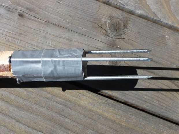 Lugar su largo 3 clavos en posición con la cabeza dentro de las muescas acanaladas. La cinta adhesiva le ayudará a mantenerlos allí al comenzar el proceso de grabación. A partir de las cabezas de los clavos, sacar una tira de 12" de cinta adhesiva y comenzar a grabar las uñas al palo. Estire la cinta realmente por lo que las cabezas de los clavos están empotradas en las muescas acanaladas.