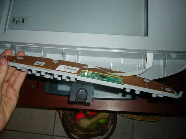 Tenga en cuenta el "gancho-como" lengüeta de plástico y plástico nub (que encaje en la lengüeta) debajo del panel lcd y a la izquierda de mi dedo sucio (lo siento--de cambio de aceite al hombre de la reparación de scanner). Empuje la lengüeta hacia arriba y deslice el teclado a la izquierda.