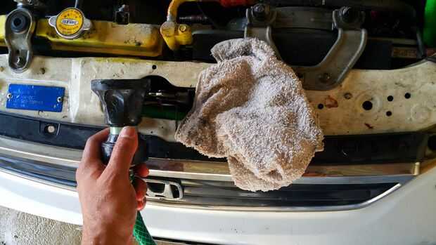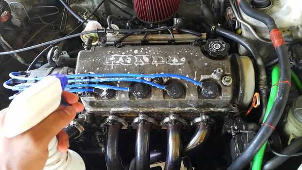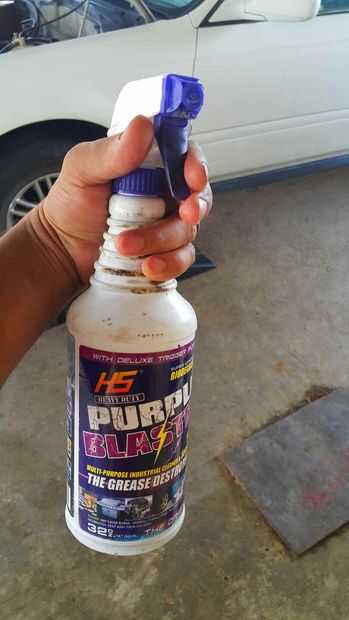 Con desengrasador de motor rociado una generosa cantidad de la misma en el motor. Dejé remojar durante 10 minutos y luego usé mi manguera y una toalla para limpiar el motor.