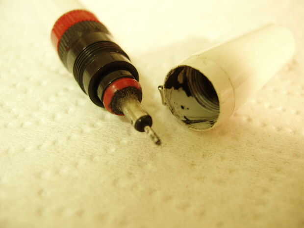 limpieza Rapidograph infierno hecho fácil:WindexInstrucciones1/4 taza Windex soluciónSemillas todo lugar con tinta bien separan en la soluciónUtilice hisopo para frotar la solución Windex dentro la tinta plástica bien. La tinta sale muy rápidamente.