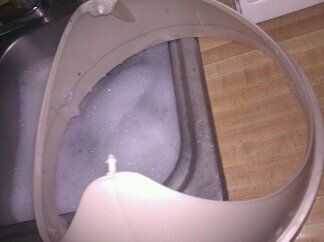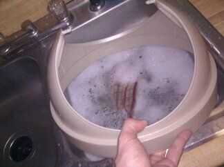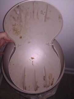 Para limpiar la basura, quite la tapa y gire la puerta 90 grados y tire hacia afuera de los "spurs" retención. La puerta y la pieza superior debe quedar aparte. Ejecutar un lavabo de agua caliente y jabón (un cubo también harán) y utilice un trapo para quitar el limo para todas las partes. Una vez que todas las piezas son bonitas y limpias vuelva a colocar la parte superior para recoger y reutilizar la papelera.