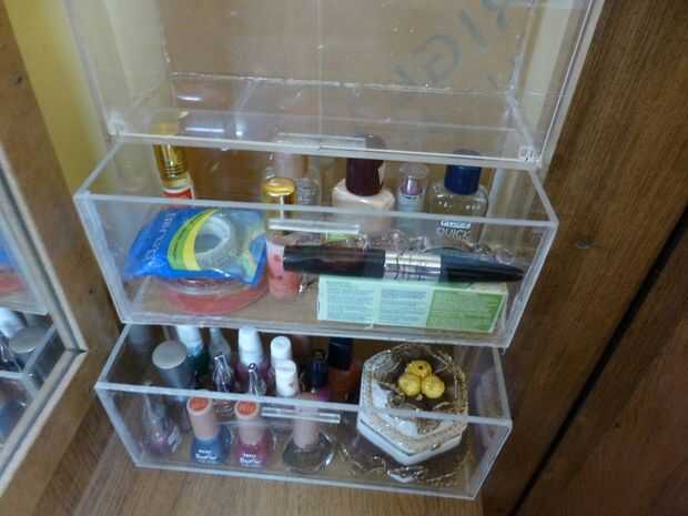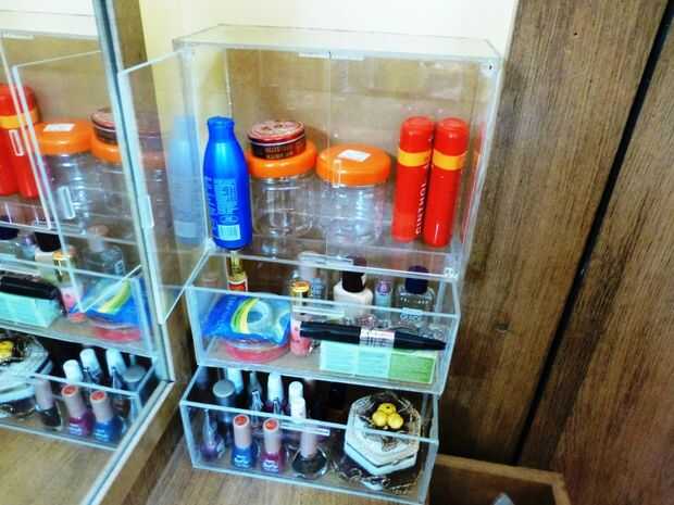 Ordenar los artículos que estaban dispersos sobre la mesa. Tanto los cajones extraíbles son del mismo tamaño y pueden contener elementos no superiores a 9 cm. Su conjunto de esmalte de uñas y estuche ocupa el cajón de abajo. Algunos perfumes, delineador de ojos y otros objetos más pequeños fueron al cajón del medio. Polvo de la cara, aceite de pelo y algunos tarros de plástico fueron colocados en la parte superior con la puerta.