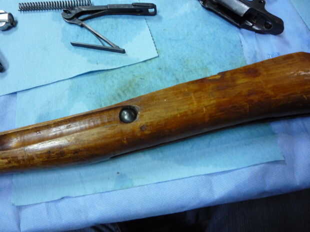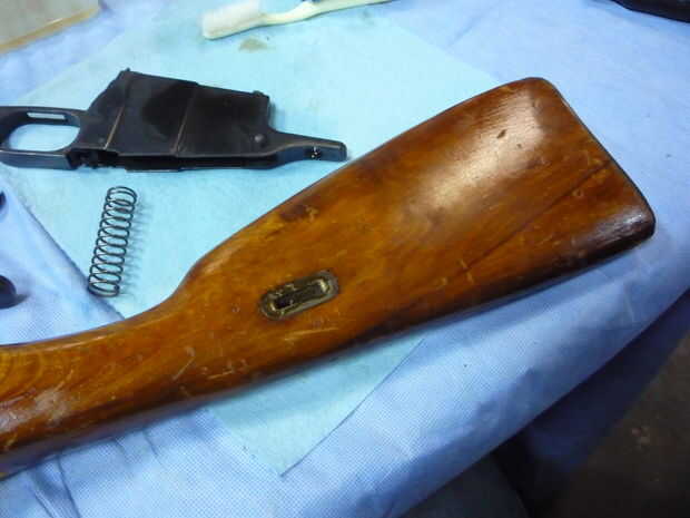 Este paso es bastante sencillo. Desea frote hacia abajo su stock con algunos alcoholes minerales para eliminar cualquier cosmoline que pueda haberse acumulado en la superficie de la madera.