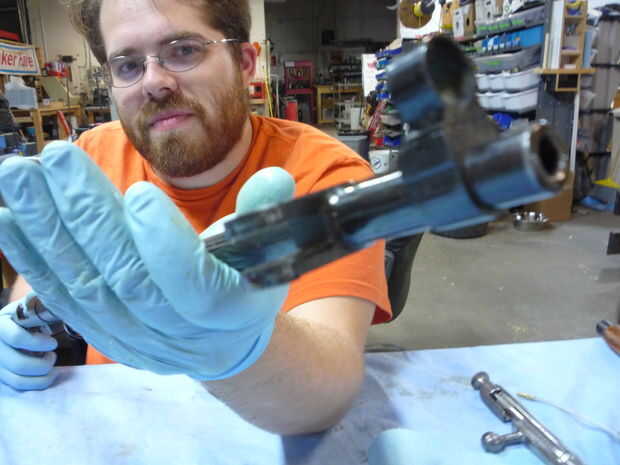 En este punto vas a empezar a volver a instalar las piezas en la culata de la pistola. Usted va a querer limpiar el exterior del barril con un lubricante, así como ejecutar un manitas con un parche empapado en aceite por el cañón limpio.