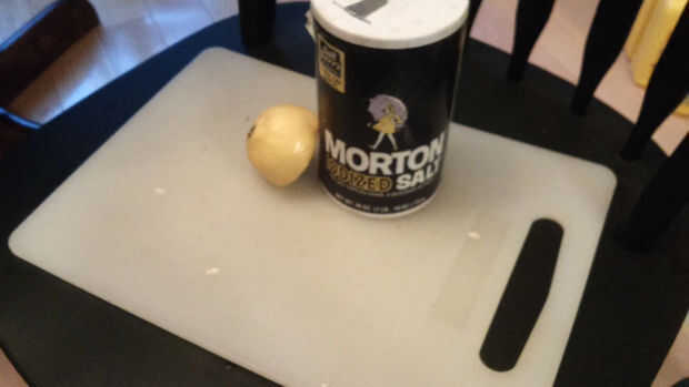 Deje de usar productos químicos caros! Salvar el planeta y utilice esta solución de limpieza muy simple!Paso # 1: 1PUR algo de sal en el tablero de cortePaso # 2: 1.1 Usted puede usar sal fina o áspera dependiendo de lo difícil que es la suciedad. O