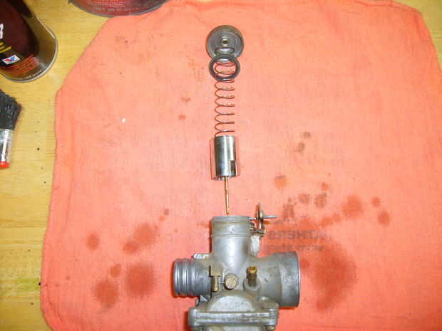 Foto 2: Después de quitar el carburador, es necesario quitar la corredera de la válvula reguladora del cable (aún atado al vehículo). Esto puede ser una tarea difícil pero la imagen se muestra completa para mostrar las piezas. Después de tener el cable zafado puede tirar todo el cable y deben tener las partes en la imagen.