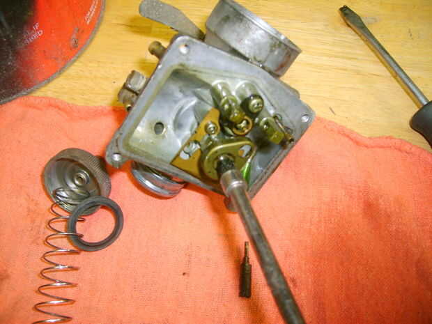 Cuadro 2: Este carburador la aguja del flotador se celebra en por una placa de chapoteo de combustible. Eliminar esta placa para que la aguja del flotador se puede sacar para limpiar.