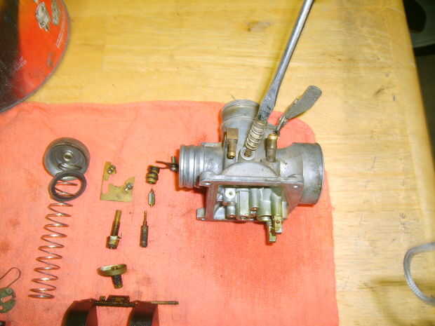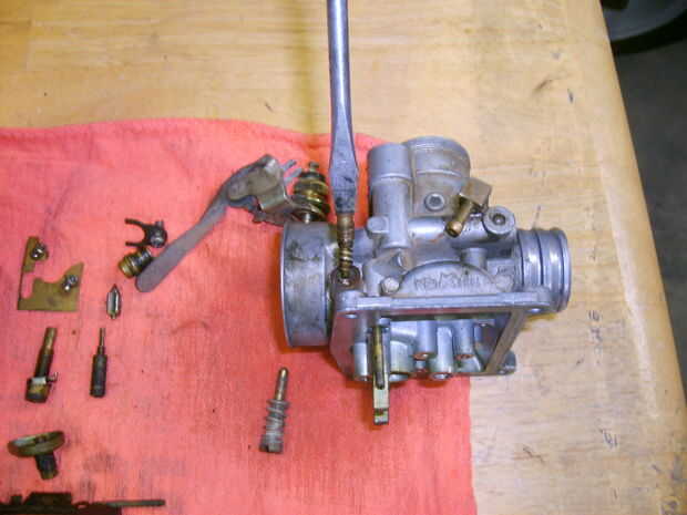 Foto 1: el último paso antes de limpiar el carburador está quitando las últimas partes del exterior. El tornillo del aire y el tornillo de ralentí se pueden quitar con un destornillador de cabeza plana. Se encuentran en los lados de lo carbohidratos. El tornillo de ralentí es el más grande tornillo que ajusta el ralentí cuando el motor está al ralentí.