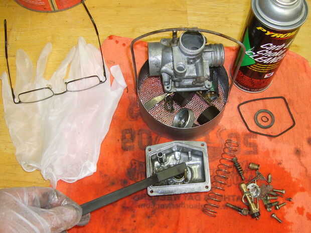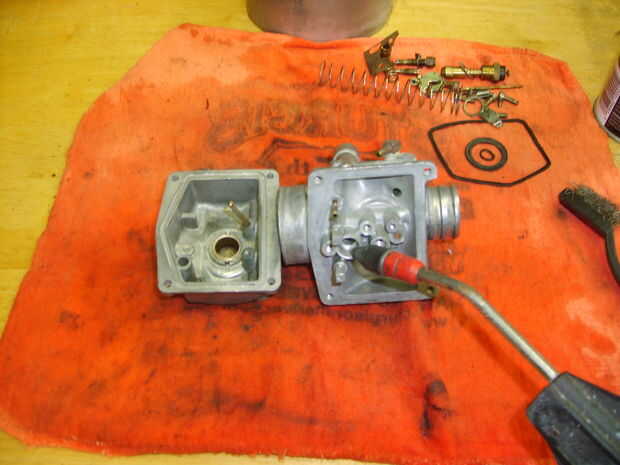 Cuadro 2: Asegúrese de que use gafas de seguridad, guantes son recomendados para la limpieza. Partes deben ser fregadas con un cepillo de alambre y luego rociadas con carburador y cebador limpiador. Rocíe el limpiador en los agujeros que el chorros de aire y tornillos de ralentí, aguja de flotador y choke de. Cuando los chorros de limpieza, asegúrese de limpiador en los agujeros. Para asegurarse de que los chorros están limpios, mire a través de ellos luz para asegurarse de que el agujero se limpia. Si los chorros no son completamente limpio, que sopla aire a través del orificio eliminará izquierda sobre escombros.