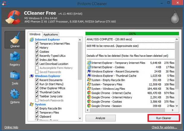 - Una vez que el análisis termina (como se muestra por la barra de progreso verde en la parte superior), haga clic en ejecutar limpiador