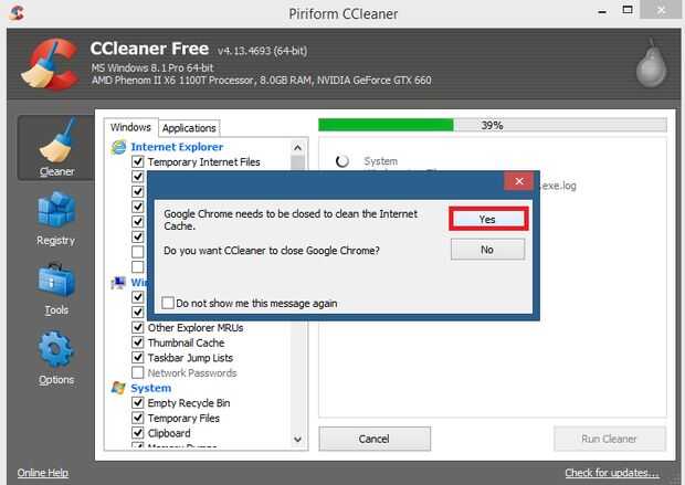 - Nota: Si tienes un navegador abierto se le pedirá para cerrar antes el funcionamiento limpiador acabado