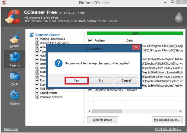 - Nota: Se le pedirá a su registro de copia de seguridad antes de corrige los problemas seleccionados, recomiendo altamente que hagas! Si usted haga clic en sí que se pedirá que se nombre la espalda hacia arriba. Llamar lo que quieras y haz clic en guardar.
