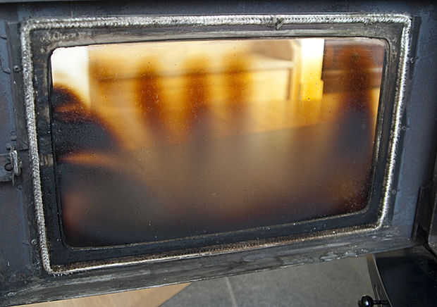 Cristal en una estufa de leña consigue sucio de la quema de madera húmeda o madera con mucha resina en él. Poco a poco consigue tan sucio no es posible ver el interior.