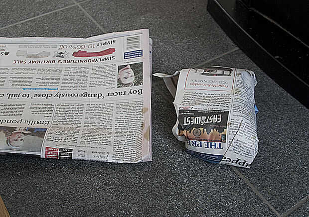 Enrollar la hoja superior del periódico que protegía el piso con el trapo y pequeños trozos de periódico. Tire a la basura. Doblar el resto del periódico y sacó con su reciclaje. Guarde el guante de goma en la bolsa de plástico y los envases de plástico de dos hasta la próxima. Almaceno la mina debajo de la tina de lavado en la ropa porque está cerca.