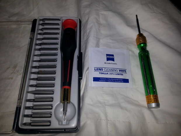 vas a necesitar un destornillador muy pequeño y un destornillador de torx t3. algunas cámaras pueden tener diferentes tornillos por lo que ayudaría a un kit de pequeña. también van a querer algunos trapos de lente. Si usted es duro de ver, estos tornillos son pequeños, ir a buscar sus gafas y una luz ahora.