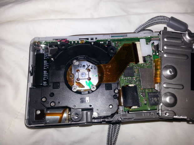 Asegúrese de no tire del cable de cinta hacia fuera de la cámara. el elemento de plata con los 3 tornillos de torx pequeño debe ser deshecho. así que entonces hacia fuera. ser suave, es donde debe ser delicado. Asegúrese de no dejar caer los tornillos pequeños o dejarlos caer en un vacío en la cámara