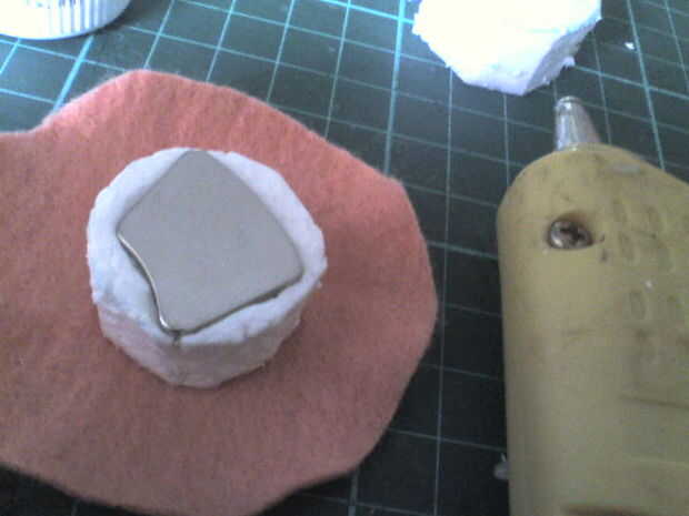 Usar la pistola de pegamento caliente para derretir la forma del imán en el poliestireno. Colocar un pequeño punto de hotglue en el poliestireno y empuje el imán