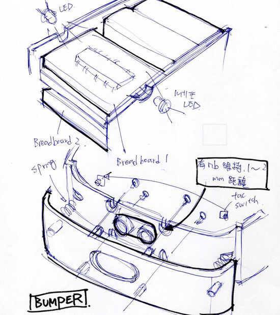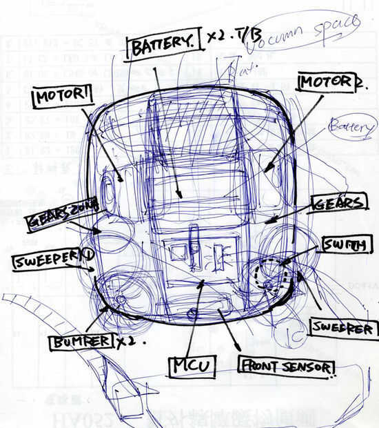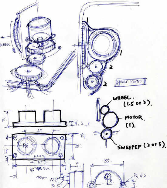 Comenzando por esbozar el diseño de su robot, en esta etapa, ya debe reunir todos los componentes y materiales que se enumeran anteriormente. Esta manera, usted conseguirá una idea aproximada sobre la dimensión y el tamaño de sus componentes mientras diseño de dibujo, pongo anotación el dibujo para indicar dónde deben colocarse los componentes. Y algunos otros esquemas para generar ideas acerca de la infraestructura interna / externa. No importa si vas a hacer o no, el esbozo ayuda a para rápidamente construir el diseño en su mente antes de mover la etapa de realización. (Como se puede ver en la foto, yo iba a usar engranajes/piñones, pero resultó es difícil obtener los engranajes de tamaño adecuado para el robot y dejar la idea de utilizar para el diseño.)