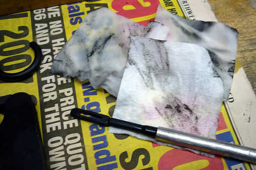 Limpie la cámara primero. Aplicar solvente en la cámara usando un parche grande, luego use un cepillo de cámara para aflojar la suciedad. Limpie el cepillo después de algunas vueltas y volver a aplicar solvente a cepillo. Utilizar algunos parches mojados para vaciar la cámara y terminar con un parche seco.