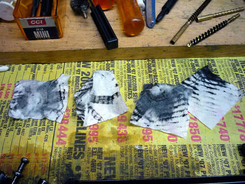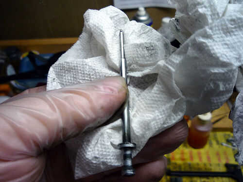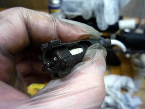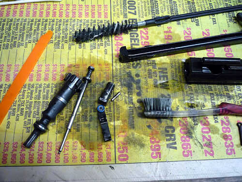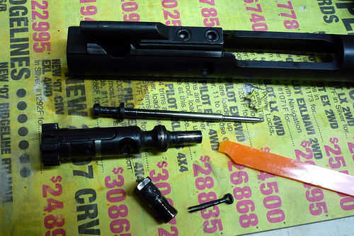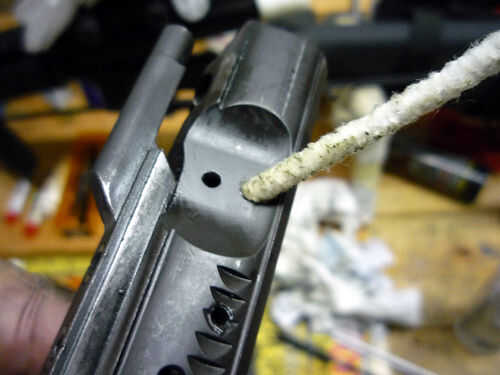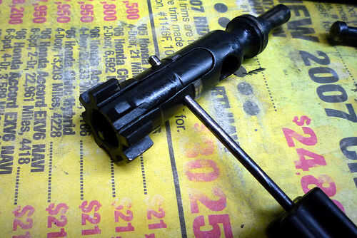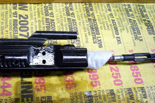 Rociar las piezas con solvente y cepillar hacia abajo. Use una varilla corta y un cepillo de nylon de calibre.45 para limpiar el interior del portador del cerrojo. La mayor parte del carbono será dentro del portador del cerrojo; nunca te lo totalmente limpia. La parte trasera del perno tendrá la acumulación de carbono, no van loco tratando de limpiarla, se fuera nunca totalmente limpio. Use un limpiador de pipa para limpiar el centro de los pernos y todos los orificios de ventilación en el portador del cerrojo.