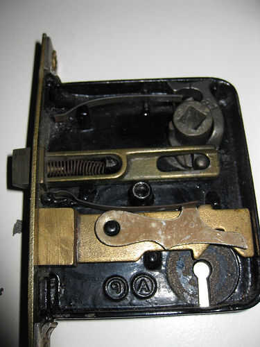 El mecanismo de cierre de este bloqueo es más fácil trabajar con porque no vuela aparte cuando se abre el caso.  Hay un resorte de hoja para la vuelta de perilla y un resorte de bobina separada para la vuelta de cierre. También el la leva eje empuja directamente en un brazo/transporte combinado.