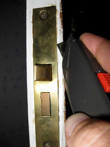 Antes de desmontar el mecanismo de la cerradura de la puerta, puede que desee marcar la brecha alrededor de la parte frontal de la cerradura con una navaja a cualquier pintura que puede estar adherido al metal libre.