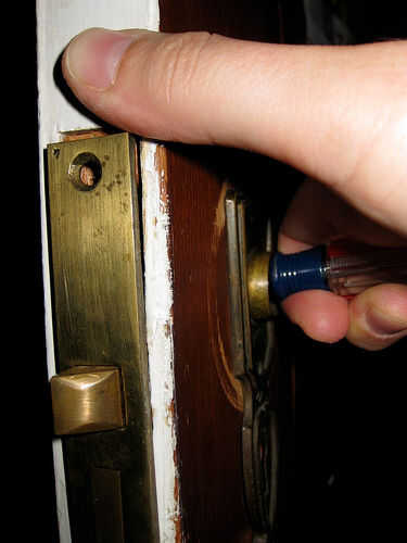 Para extraer el mecanismo de cierre de un agujero de mortaja apretado, coloque un destornillador pequeño a través del agujero donde estaba el eje y empuje suavemente hacia delante para liberar la cara de la cerradura de la madera.