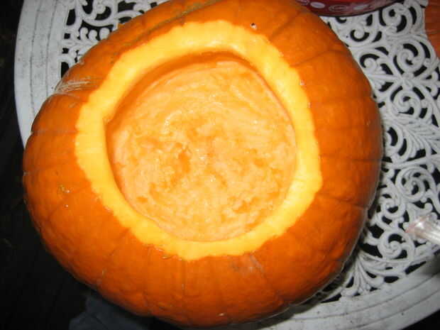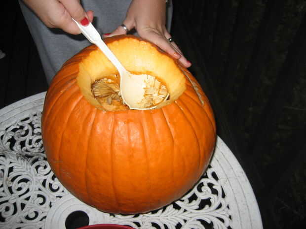 Aquí viene el messiest y a veces más agradable parte de este Instructable. Quitar todas las semillas y cuerdas dentro de la calabaza. Esto se hace más fácil con una cuchara de cocina grande o un cucharón. También es una buena idea de afeitarse por las paredes de la calabaza con una cuchara sobre una pulgada de espesor, para facilitar la talla.