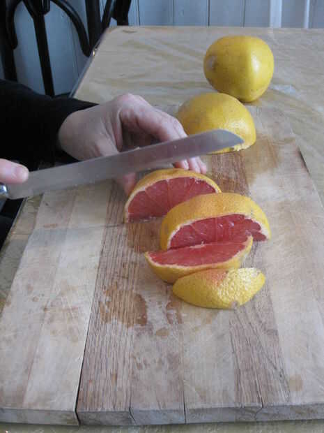 Ahora, simplemente cortar el pomelo en gajos. La ventaja de este método es: después de comer un triángulo de la pulposa fruta, usted puede muy fácilmente Retire la sección de médula guardando el siguiente. Además, las semillas son fácilmente encendió lejos.