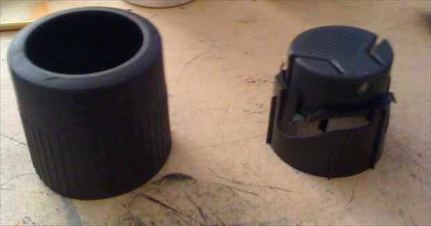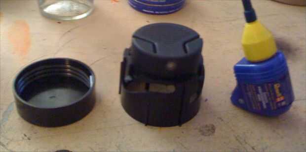 poner pegamento alrededor de la tapa de la botella de especias y deslice dentro de ella debe dejar al ras con la parte inferior. Una vez seco se puede poner esta sección nuevamente dentro de las latas tapa.