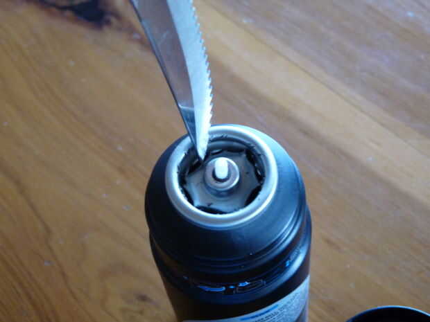 Asegúrese de que antes que pone cualquier pinchazos en el poder que ha sido liberado de la presión! la lata debe ser totalmente vacía, en no puede oír cualquier gas que sale de él al todos los vacíos... no puedo insisto esta bastante chicos, si no haces este paso equivocado podría terminar dañando a ustedes mismos y no tomar ninguna responsabilidad por cualquier cosa que resulta en sus lesiones o la muerte... ni tampoco unilever (fabricante del lince). Después de soltar toda la presión debe recortar la parte que se muestra en la imagen por varias ocasiones pucturing.