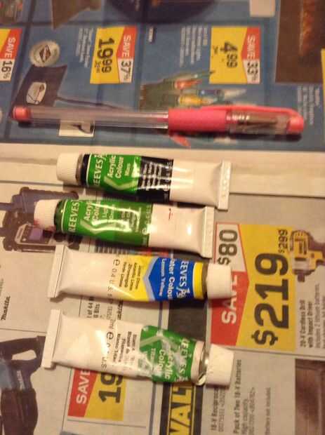 y algunas verde negro amarillo blanco y rosa (o no tengo un color de rosa así que usé una pluma) pinturas