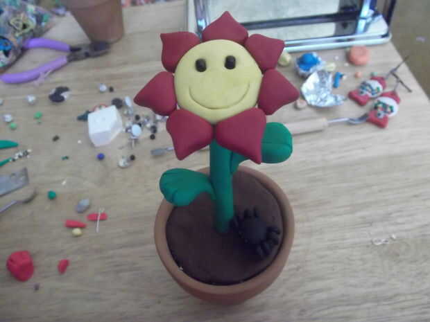 Mayoría del polímero arcillas hornear por 15 minutos por cada 1/4 de pulgada de espesor, a 275 grados, no cuecen al horno el pote, no se, hacer su suciedad y flor desmontable, hice mía en 3 piezas separadas y a pegar en su panadería.