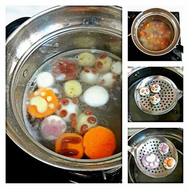 Añadir el yuan tang en el agua hirviendo y cocine hasta que flotan a la superficie.