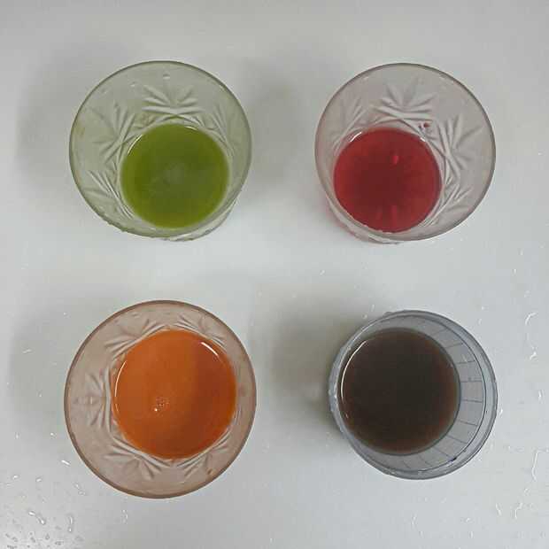 Púrpura = 2 cucharadas de jugo de baya negra + 1 cucharadita de zumo de remolacha
