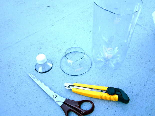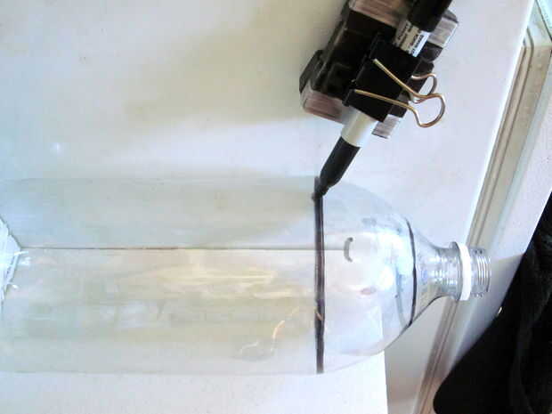 Se desea utilizar la parte superior de la botella de plástico pop. Marque donde desea que las líneas de corte en la botella. (Consejo para dibujar líneas perfectamente rectas: utilice un clip de metal para aferrarse a su marcador y pegar el clip a un imán en el refrigerador. Luego coloque su botella para que esté tocando la nevera y colocar el marcador de manera que esté en contacto con la botella. Gire la botella alrededor de todo el camino que han trazado una línea todo el camino alrededor de la botella.)