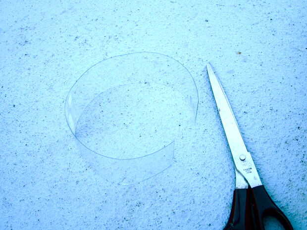 Para cortar la botella, primero usé un cuchillo para hacer un pinchazo y luego continué con las tijeras. Una vez que se corta la parte de la cúpula, puede trabajar en la cavidad interior. Usted tendrá que cortar una tira de la botella que está sobre una mitad de una pulgada menor que la parte de la cúpula