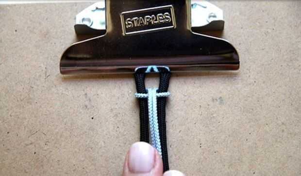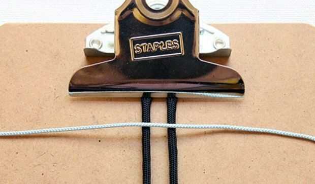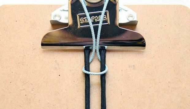 Una cuerda debajo del clip en bucle y ponen el otra cadena, cordón sobre el otro uniformemente. Tire de los extremos y sobre.