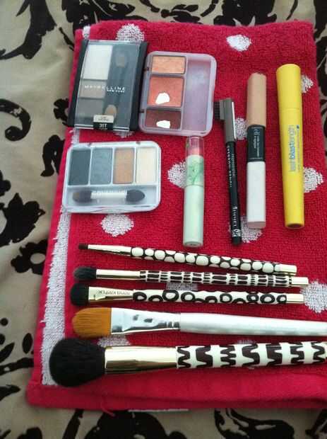 Colores de una paleta de colores que tiene el neutro en él (yo usé la maybelline naturals chic 35T de almendra satén) una paleta de oro (yo usé covergirl 700) Blush (utilicé un covergirl) lápiz de cejas con cepillo (utiliza rimmel 002 hazel) corrector / cartilla (utilicé brillo medio de E.L.F) Mascara (utiliza longitud de covergirl lash blast en marrón) un lindo y ligero lápiz labial o brillo (yo usé covergirl 230 coral de naturals) un pequeño pliegue cepillo sombra de ojos cepillo Fundación cepillo Y pincel blush