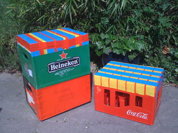 Como son cajones realmente podría apilar em para la altura de la silla (2 cajones), o como taburetes (3 cajones). Es una manera perfectamente funcional para ocultar o distribuir sus botellas, vacíos o llenos.