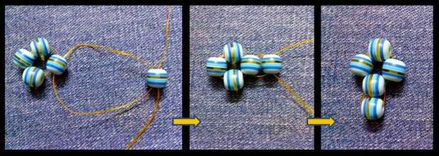 Una vez más, poner un grano de Quinta por un extremo del hilo y cruzar ese grano con el hilo como hecho en el paso anterior.