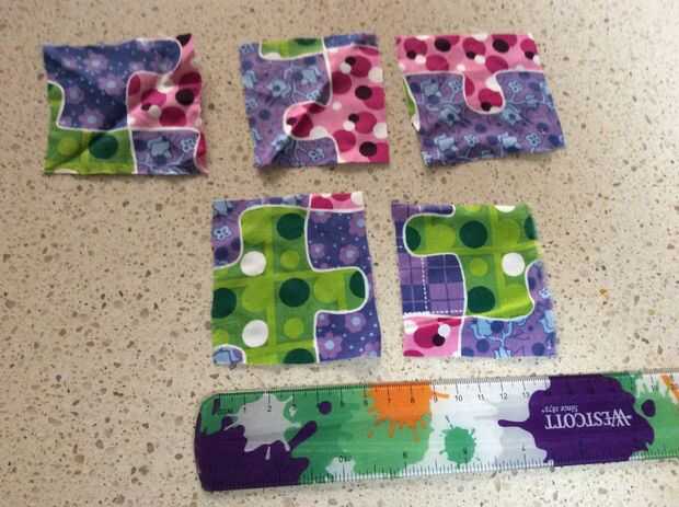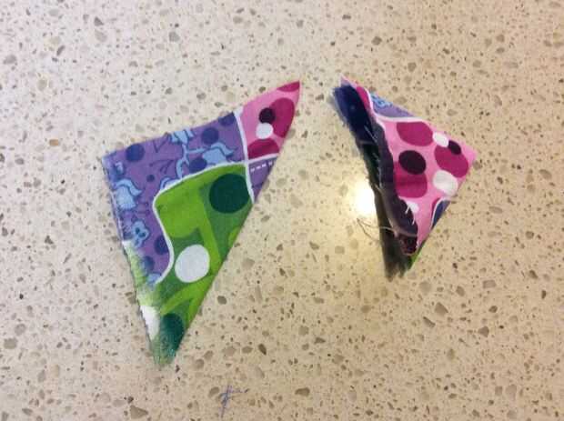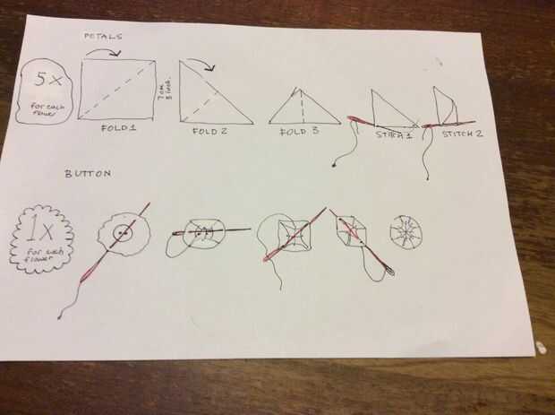 Corte 5 cuadrados de 7cm/3 pulgadas de la tela y luego doblar 3 veces por la mitad como se muestra en las fotos y el dibujo.