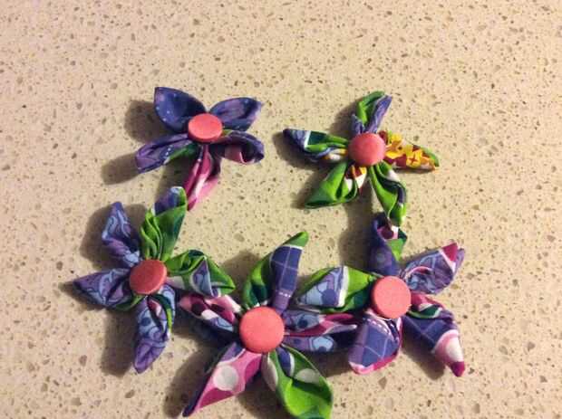 cómo hacer flores de tela, como una brocha o una diapositiva de peloPaso 1: Flores de tela Para hacer flores de tela, corta 5 círculos de material.  Un CD viejo es un buen tamaño.Hierro plano y luego doblar una y otra vez y hierro plana, para hacer u
