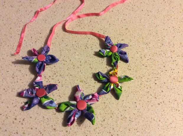 El número de flores depende de su diseño único, hice cinco flores. Me he unido al segundo pétalo de la flor primera al quinto pétalo de flor de segunda con un pétalo hacia arriba, y dos sueltas hacia abajo. Dos hacen que sea más seguro que fija a una cinta. La variación en el diseño puede hacer este collar adecuado para cualquier lugar. Telas de seda blanco para novia, negro para un vestido de noche o casual simplemente feliz, como se muestra. ¡ Disfrute! Espero que les guste este instructable.