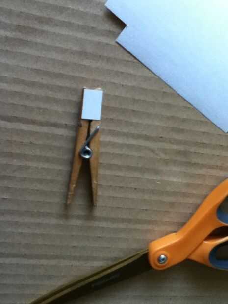 Tomar la notecard, pinza y tijeras y cortar un pedazo pequeño de la notecard del tamaño de la boca de la pinza para la ropa. Puede utilizar un lápiz para marcar donde cortar.